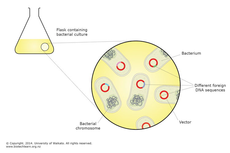 In a bacterial library, each bacterium contains a different DNA sequence. Each DNA sequence is housed in the same cloning vector.